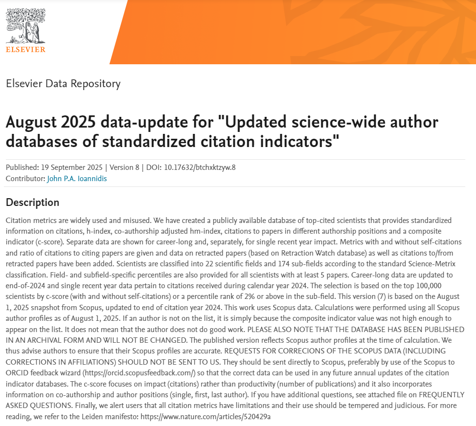 该榜单是斯坦福大学John P. A. Ioannidis教授团队与Elsevier与合作的项目成果,发布在Elsevier旗下的Mendeley Data网站上。榜单主要分为“终身科学影响力排行榜(career-long impact)”和“年度科学影响力排行榜(single-year impact)”两个榜单,前者关注整个学术生涯迄今的影响力,后者聚焦本年度的学术成就。榜单基于Scopus数据库的引用数据系统分析,以被引数(区分自引和他引,提供自引数据)、H指数、HM因子等6种综合指标(composite score,C-score),从全球近700万名科学家中遴选出世界排名前2%的科学家,分为22个领域和174个细分子领域,为科学家长期科研表现提供了一个衡量指标,客观真实反映科学家的学术影响力。